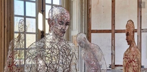 L’œuvre de Raija Jokinen traduit concrètement cette vision, qu’elle rend accessible à tous les visiteurs de son exposition. Dans les ruines du château bombardé pendant la seconde guerre mondiale puis laissé à l’abandon pendant des décennies, l’artiste textile installe des figures humaines tressées dans une fibre de lin mélangée à de l’amidon de riz, matière organique laissant passer la lumière. Dessins ? Sculptures ? Raija Jokinen définit son art comme hybride. Il l’est, à tous les sens du terme. Car si pour elle, l’être humain n’est pas hors-sol, et fait partie du règne animal tout comme il est relié au règne végétal, il n’est pas non plus hors du temps. De ces figures partent des lacis colorés évoquant des réseaux sanguins reliés à leur environnement mais aussi, à travers le temps, à celles et ceux qui ont vécu là, avant les guerres. Et plus largement encore la relation s’étend à tous les êtres vivants, animaux, plantes, qui peuplent le parc de leur présence
