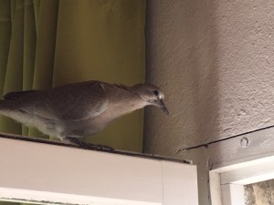 Le soir, on discute sur la terrasse (politique, montée de la violence, déchirement de la société, chacun campe sur ses positions, s’échauffe, argumente sans tenir aucun compte de l’autre) quand résonne une voix féminine depuis l’intérieur de la maison : une tourterelle est venue se poser sur le miroir de sa chambre. Tout le monde se précipite pour venir voir l’oiseau qui reste là, tranquille, en équilibre sur son drôle de perchoir. De temps à autre un mouvement imperceptible de la tête révèle la finesse de ses lignes. On s’interroge : est-elle blessée? Malade? Mourante peut être? Indifférente à nos conjectures, la tourterelle, d’un coup d’aile, va se poser sur le rebord de la fenêtre. Un rayon du soleil couchant caresse son plumage d’un gris tendre et chaud.