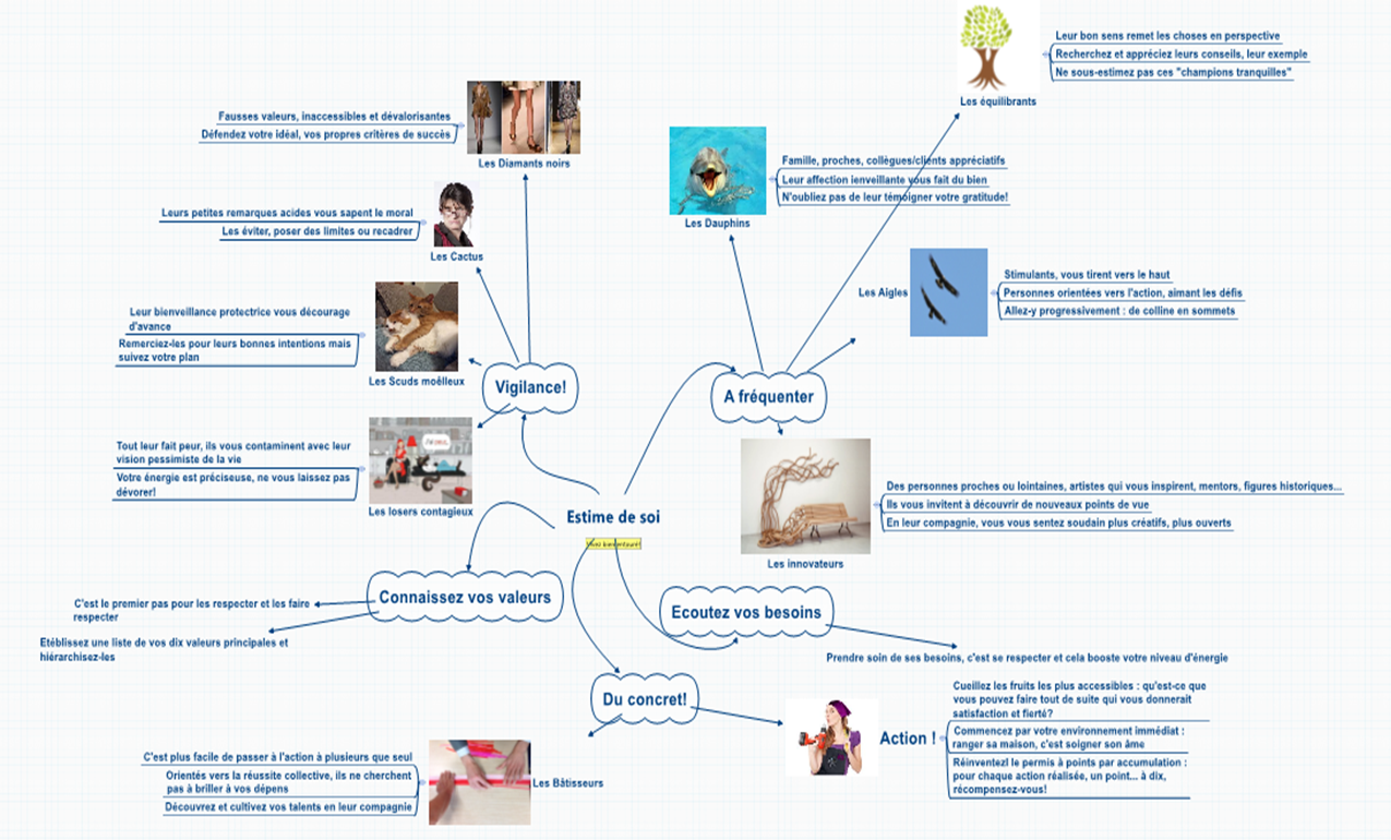 Nous appellerons ces personnes les « dauphins ». Et pour compléter le tableau, recherchez également la présence de « mentors », des « aigles » qui vous stimulent par leur exemple et leur dynamisme et vous invitent à prendre votre envol. Voici un lien vers une carte heuristique (mind map) qui représente les différentes personnes de votre entourage et leur influence, bénéfique ou toxique.